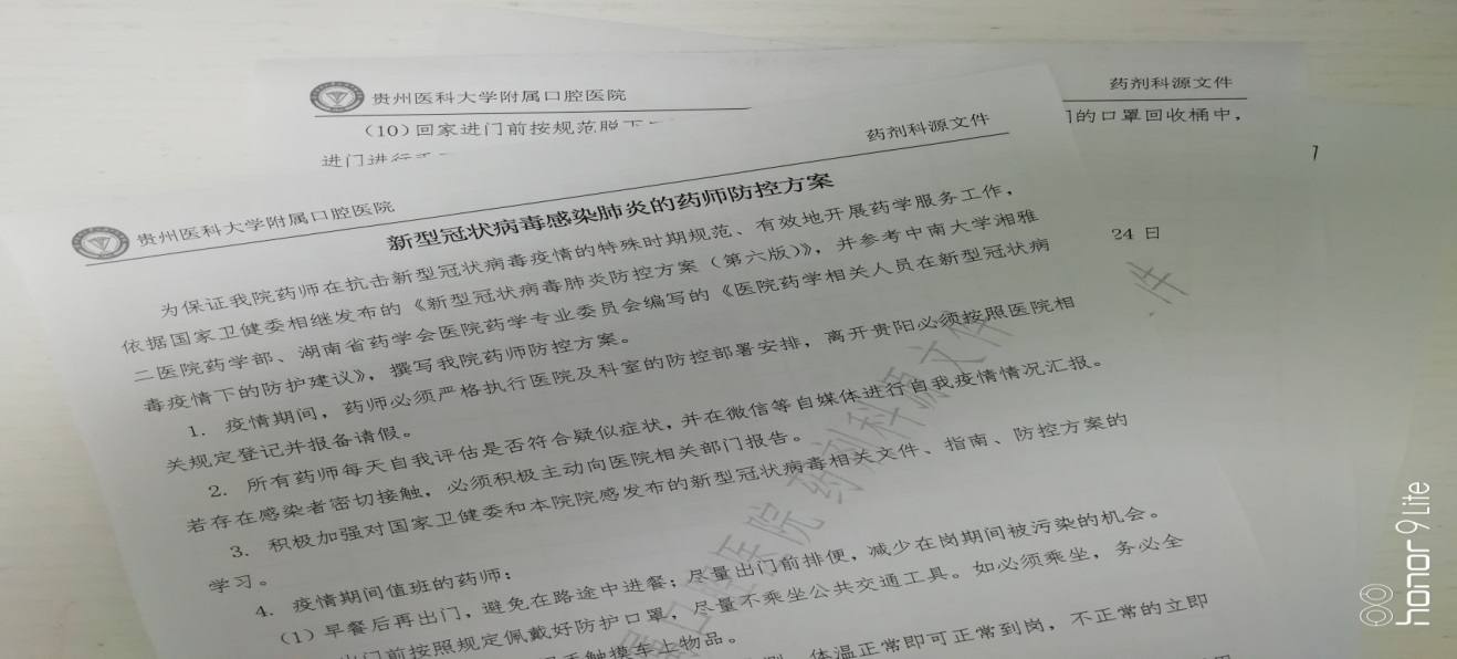 为保障口腔急病症患者用药需求,保障特殊时期公司临床科室诊疗工作的开展,我们药师每天24小时在岗。同时,还按照医院疫情防护要求,严格执行上岗戴外科口罩、戴医用防护帽、戴手套、勤洗手、早晚监测体温、、、我科党员药师王作荣同志还积极参加了医院预检分诊处的值班工作。同时,我们制定了符合药剂科的疫情防控方案,指导与规范了药师疫情防控措施的执行,为保护好自己,保护好患者,贡献了药师专业智慧。