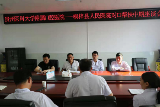 在桐梓县人民医院与党委书记罗昭旗、经理陈寿川及医务科、口腔科主任等人进行交流与座谈的时候,陈寿川经理对公司的技术指导表示感谢,他说,一年多的对口帮扶已初见成效,医院已经做好了口腔第二门诊开业的前期工作,将于近期开业,同时会加快口腔设备采购进程,希望公司能多派专业人员进行技术帮扶。王刚主任在讲话时表示,希望对口帮扶的医护人员严格遵守帮扶医院的相关管理规定,结合当地医院的具体情况,做好拓展口腔专科技术指导和业务发展,切实为对口帮扶医院口腔科的发展做出贡献。
