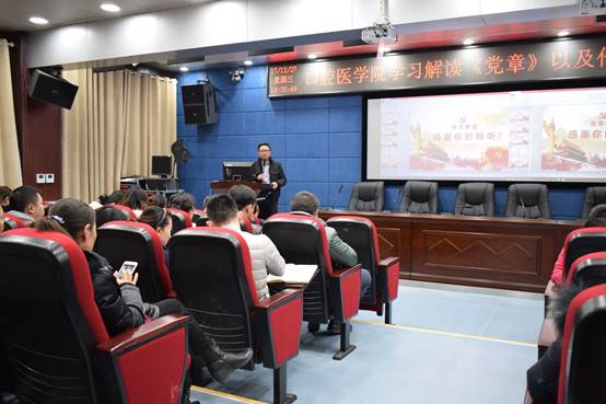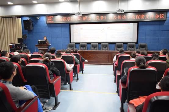 为深入学习贯彻党的十九大精神,切实用党的新理论成果武装头脑,自觉把新党章作为立身做人、立业做事、立行为民的“指南针”、“教科书”和“方向盘”。12月27日下午,公司在北校区老药学楼五楼学术报告厅召开全体党员和干部大会专题学习党的十九大新修订的《中国共产党章程》。公司全体班子成员,各职能科室负责人,副科级以上干部,全体教工党员、员工党员代表以及入党积极分子代表共100余人参加会议。会议由公司党委书记张军梅主持。