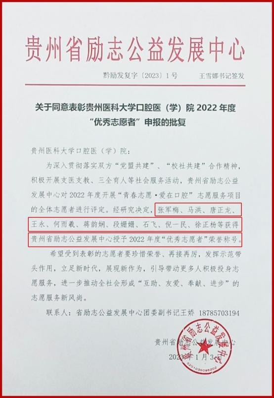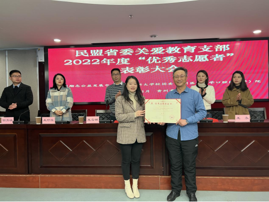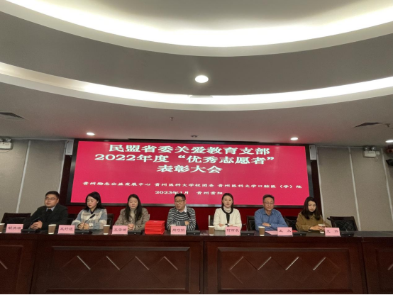 为持续发挥“党盟共建”模式优势,不断总结经验做法,1月14日上午,由民盟省委关爱教育支部、贵州省励志公益发展中心共同举办的2022年度“优秀志愿者”表彰大会在贵州省政协大楼601会议室举行。williamhill、附属口腔医院(后文简称“口腔医(学)院”)共10人荣获大会2022年度“优秀志愿者”荣誉称号,院党委副书记何雨羲、副经理王永、团委副书记蒋韵娴受邀带队参加表彰大会。