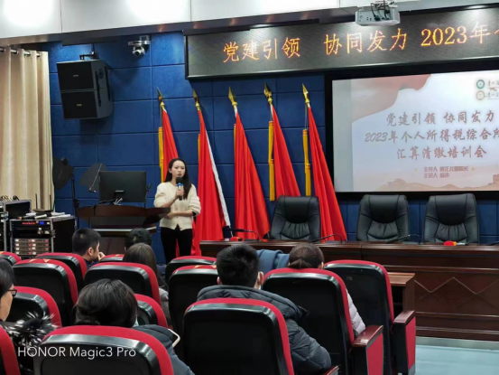 为进一步贯彻落实个人所得税、专项附加扣除政策,普及个税相关知识,顺利完成2022年个人所得税综合所得汇算清缴工作,2月21日下午,财务科牵头举办了2023年个人所得税综合所得汇算清缴培训会,副经理唐正龙主持会议,贵州省税务局黔灵分局杨声、施林主讲,院临床、医技、行政科室代表参加此次培训。