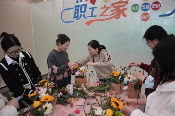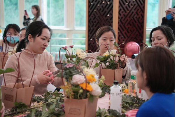 当天最后一个集体活动为“与花为伴 · 绽放芳华”女职工插花活动。活动特邀请贵阳招商银行南明支行花艺老师现场教授花艺知识,女职工们在花艺老师指导下,修剪花枝、整理花朵、构思插花位置,对手中的花材进行DIY创作。在一修一剪之间,桌上一束束细致精美、别出心裁的插花作品逐渐完成,让人置身一片花海,芬芳沁人心脾,大家脸上洋溢的灿烂笑容,比鲜花还要美丽。