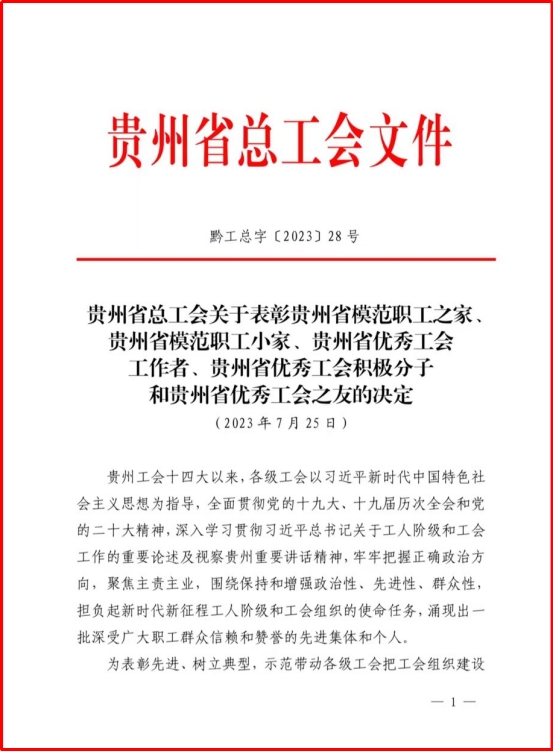 7月26日下午,贵州省总工会印发《关于表彰贵州省模范职工之家、贵州省模范职工小家、贵州省优秀工会工作者、贵州省优秀工会积极分子和贵州省优秀工会之友的决定》,公司工会主席杨蕾荣获“贵州省优秀工会工作者”称号。