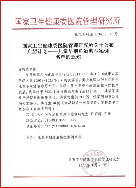 为贯彻落实《健康中国行动(2019-2030年)》 《健康口腔行动方案(2019-2025年)》有关要求,提升我国口腔医疗机构儿童早期矫治诊疗水平,国家卫生健康委医院管理研究所于2023年6月组织开展启颜计划——儿童早期矫治典型案例征集活动,公司积极组织儿童/青少年牙颌颜面发育管理及早期矫治中心(以下简称“早矫中心”)医务人员参与,共有三例病例成功收录至典型病例集册。