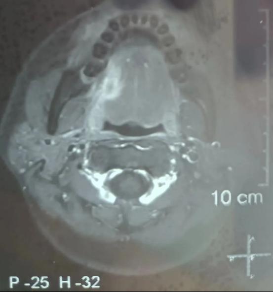 今年34岁的患者因“右舌缘疼痛性包块3+月”到公司口腔颌面外科住院治疗,完善病理活检及颌面部MRI检查后明确为右舌缘鳞状细胞癌,临床分期为cT3N0M0,且肿瘤已侵犯右侧舌外肌。