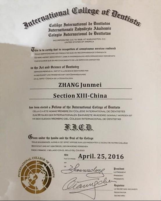 4月25日,国际牙医师公司中国区2016年学术年会暨院士授予大会在四川成都市新国际会展中心举行。公司党委书记张军梅经中华口腔医学会推荐、国际牙医师公司国际理事会的层层筛选,凭借优秀的临床科研成绩、领导才能、个人品德及技术成就,荣获国际牙医师公司中国区(ICD Section XIII-China)院士称号。