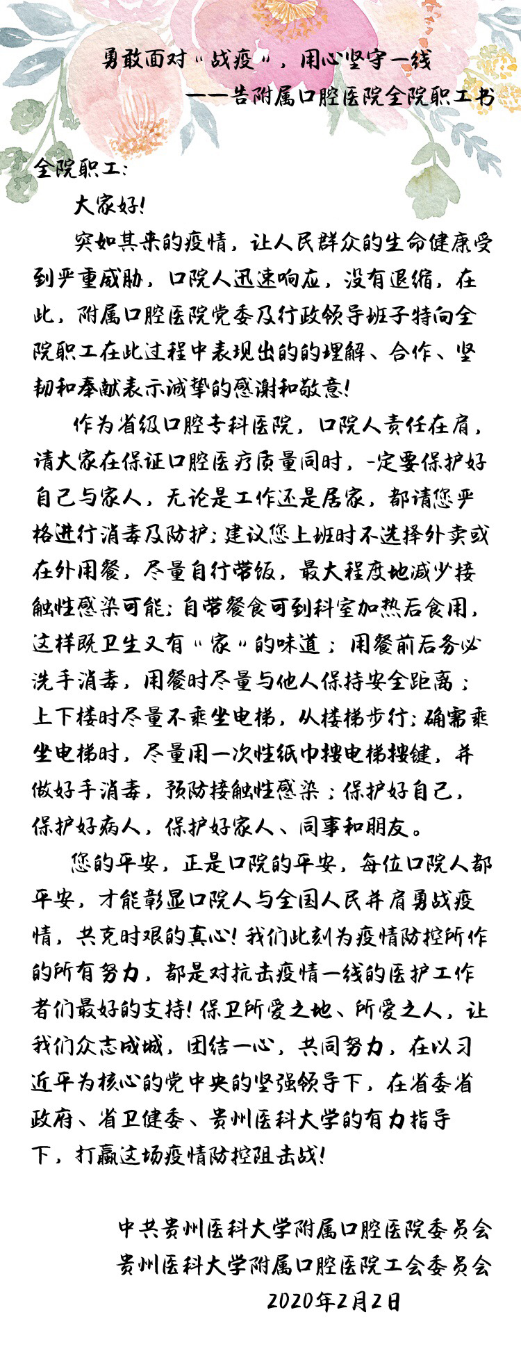 勇敢面对“战疫”,用心坚守一线——告附属口腔医院全院职工书