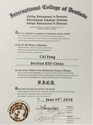 2018年蔡扬教授获得国际牙医师公司(ICD)中国区院士称号
