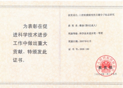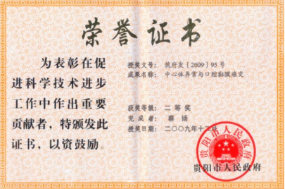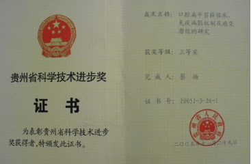 (三)在科研工作中,教研室已在口腔黏膜病及牙周病两个主要学科形成了成熟稳定研究方向,尤其是口腔黏膜病基础与临床研究方面在贵州省具有明显领先优势,并在国内有一定影响力。近5年来获国家自然科学基金3项,省部级课题23项,主持或参与省厅级及校级教改项目10项。在国内外专业学术期刊发表学术论文80余篇,其中,《中华口腔医学杂志》等核心期刊60余篇,SCI收录期刊10篇,获省部级科技进步奖3项。本教研室每年培养口腔黏膜病学及牙周病学方向硕士研究生2-3人,目前为止已培养硕士研究生30余人,绝大多数活跃在省内口腔医学临床及教学第一线,已经成为贵州省口腔黏膜病及牙周病专业方向的骨干力量。