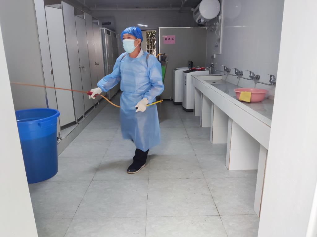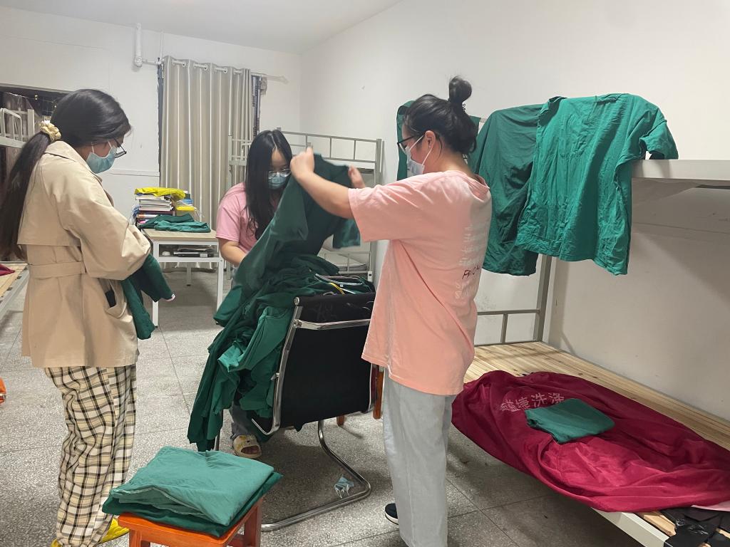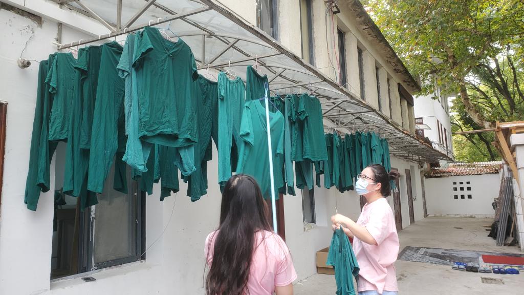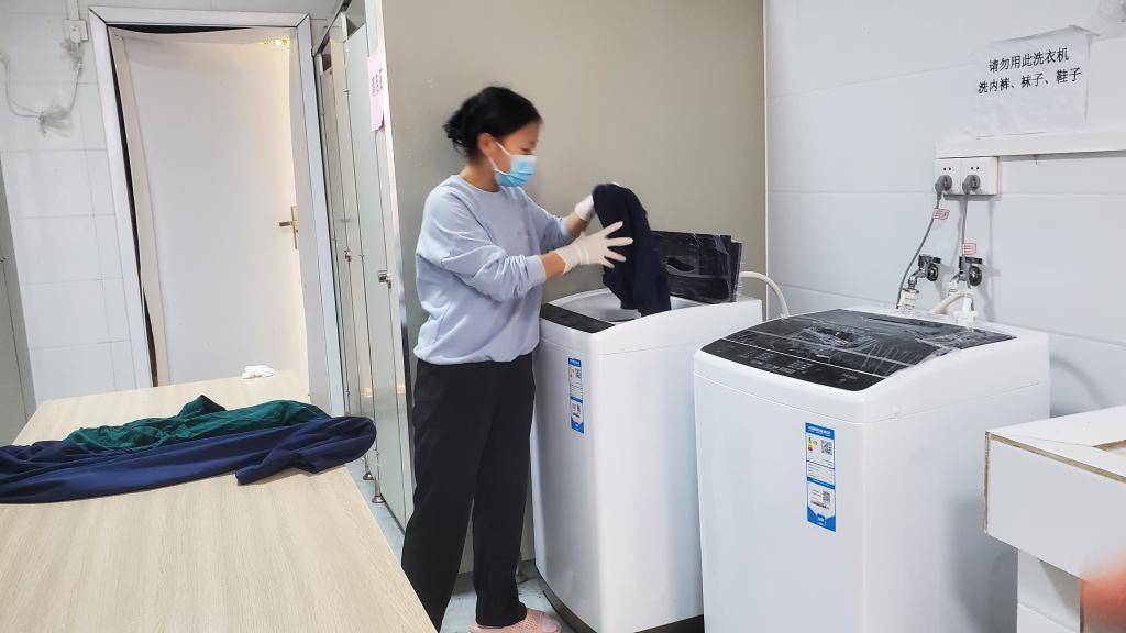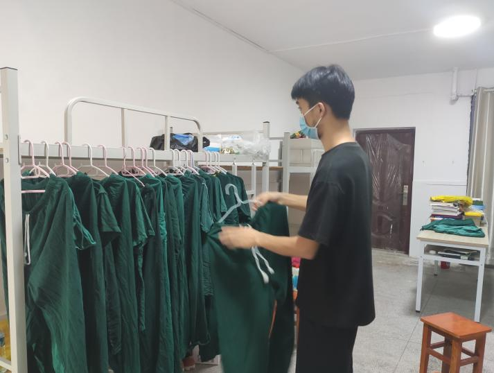每天早上小组成员前一天消杀衣服进行清点整理,由宿舍管理员对相应区域进行消杀;下午,小组成员要对当天衣物进行消毒、清洗、晾晒,确保疫情防控工作人员衣物正常供应。正是他们的默默奉献与院里其他后勤保障人员打好配合、坚守后方,才能使一线工作人员放心、安心。
