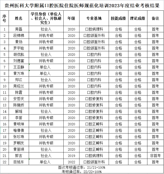 7月3日,贵州省卫生人才中心公布了 2023 年住院医师规范化培训结业临床实践能力考核和理论考核结果,williamhill官网附属口腔医院22名结业住院医师全部通过考试,其中首次参加考核21人,首次考核通过率100%,较去年增长4.17%。
