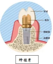 三、种植牙:是将纯钛金属经过精密设计制成类似牙根的圆柱体或其他形状,以外科手术的方式植入缺牙区的牙槽骨内,再在人工牙根上制作烤瓷/全瓷牙冠。因其牢固美观、结实耐用,被誉为“人类的第三副牙齿”。