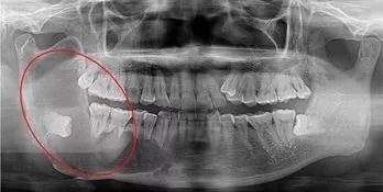 7、智齿周围囊性病变:下颌阻生的智齿常常形成囊肿,引起骨头吸收。