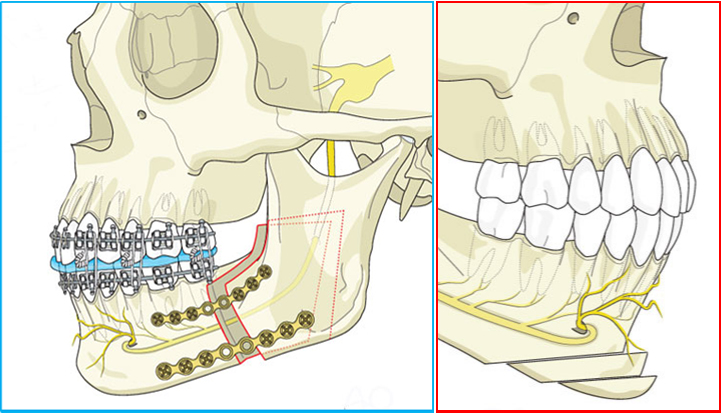 左图 下颌骨手术及内固定;右图 颏部前移成形术