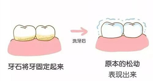 大量的牙石像夹板一样“固定”着牙齿,使原本松动的牙齿让患者不易察觉,洗牙去除牙石后,患者更易察觉牙齿的松动。牙石、牙菌斑等如不及时去除,牙周炎则逐渐加重,进而出现牙齿移动、松动加重、脱落等。