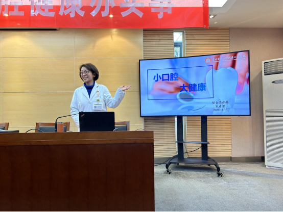 活动中,口腔医院教工第七党支部宋彦蓉以“小口腔,大健康”为题作口腔宣教,细致讲解了龋齿、牙周病等疾病的防护知识,强调口腔健康必须做到早预防、早发现、早治疗。口腔医院教工第九党支部黄丝雨围绕医保政策作宣讲,并针对大家关心的相关问题进行解答,引导大家知法守法并正确使用医保基金,形成自觉维护医保基金安全的意识。