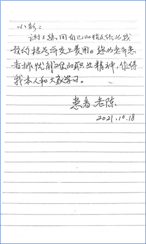 10月18日上午,该老年患者按时来院就诊。诊疗完成后,患者当面手写感谢信,并用现金归还挂号费用,第一时间表达了对彭大双的感谢。患者说到:“我在williamhill官网附属口腔医院感受到了医护人员无微不至的关爱,感谢你们积极为老年患者排忧解难,这样的精神值得我本人和大家学习。”