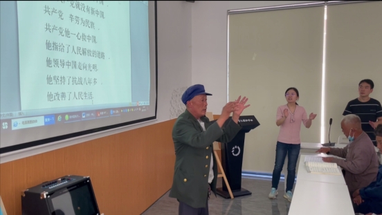 (williamhill官网口腔医(学)公司党委副书记、经理马洪,党委副书记何雨羲,党委委员刘洪静以及工作人员与老年同志们共唱红歌)