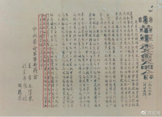 毛泽东起草《中国共产党致中国国民党书》。致国民党书呼吁:停止内战,一致抗日,实现国共两党的重新合作,发动神圣的民族自卫战争,抵抗日本帝国主义的进攻,保卫及恢复中国的领土主权。公开信郑重宣告:我们赞助建立全中国统一的民主共和国,在全国统一的民主共和国建立之时,苏维埃区域可成为全中国统一的民主共和国的一个组成部分,苏区人民的代表将参加全中国的国会,并在苏区实行与全中国一样的民主制度。我们愿意同你们结成一个坚固的革命的统一战线,我们早已准备着在任何地方与任何时候派出自己的全权代表,同贵党的全权代表一道,开始具体实际的谈判,以期迅速订立抗日救国的具体协定。这封致国民党书收入《毛泽东文集》第一卷。
