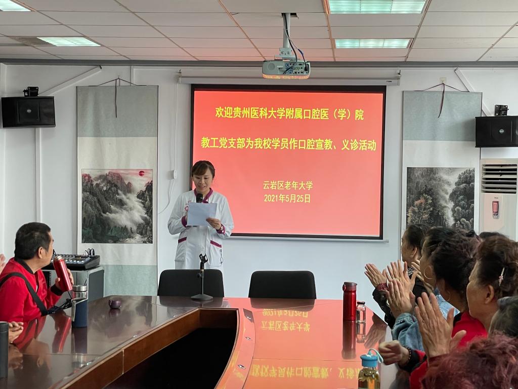 为进一步推动党史学习教育与医疗服务、健康义诊等活动深度融合,引导党员干部发扬党的优良传统和作风,切实把党史学习转化为干实事、办实事的动力,用心用情立足岗位出成效,5月25日上午,公司教工七(综合急诊)支部书记刘洪静、教工九(行政)支部书记魏颖带领两个支部党员同志在云岩区老年大学开展了“进老年大学,送口腔健康”主题党日活动。