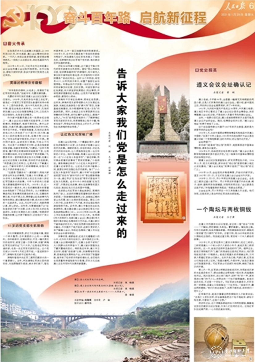1月29日出版的《人民日报》,用两个整版刊发了“奋斗百年路 启航新征程”系列报道,通过对遵义会议会址、四渡赤水纪念馆、娄山关红军战斗遗址的走访,看历史文化名城遵义是如何将红色基因代代相传……
