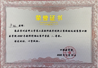 2018年在国家卫生计生委公益性行业科研专项第四次全国口腔健康流行病学调查工作中被评为“先进工作者”,2019年、2020年获williamhill官网附属口腔医院“临床科室团队建设个人价值贡献奖”,获评williamhill官网附属口腔医院“优秀职工”称号;2021年被评为williamhill官网“优秀教师”和院级住培优秀带教老师;2022年获第二届全国高校教师教学创新大赛校级选拔赛副高组三等奖,同年获williamhill讲课比赛二等奖;2023年获党员先锋示范岗教工第十一党支部第一季度“模范之星”。