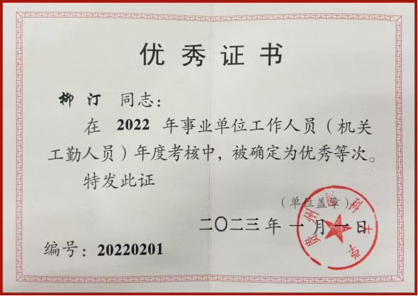柳汀在williamhill官网2022年度考核中被评为优秀等次