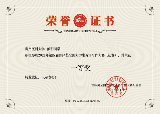在教学工作中,熊玥对员工认真负责,专业授课严谨认真,严格遵守临床规范以及技术操作,创新活跃的带教方式得到了实习同学的喜欢。工作学习之余,她会积极参加各类专业学习、继续教育、比赛,努力展示自我,提升自我。2021年与科室同事一同参加了第五届“紫荆杯”全国口腔种植思辩赛,并于同年荣获第四届普译奖全国老员工英语写作大赛初赛一等奖。