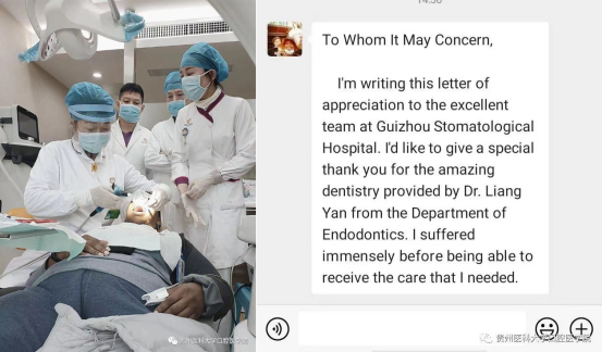梁燕将为病人解忧作为毕生追求,常说:“医者,德为先。要将匠心与爱心融合,才能真正为患者解忧,才能成为一个优秀的医务工作者。”她是这么说的,也是这么做的。2021年3月,一位外国友人患者因为牙痛来到公司牙体牙髓科就诊,经过科室主任梁燕仔细检查,决定该患者的治疗方案是根管治疗。患者对疼痛非常敏感,梁燕在麻醉科协助下采取了笑气麻醉的方式对患者行根管治疗,整个治疗期间,患者治疗体验舒适,不断竖起大拇指,并发来感谢的信息。