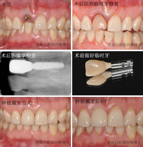 术后4年复查,种植牙周围牙龈形态较刚戴牙时更协调。临床上经常会遇到因外伤致上前牙折断或者缺失的患者,通过合理的诊断设计,术前检查完善的前提下,即刻种植+即刻修复治疗方案能解决美观问题,而且远期效果也非常好。