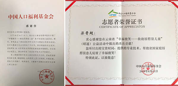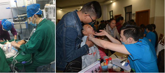 6月10日,中国人口福利基金会“幸福微笑集中救治活动”在云南昭通展开,医院派遣梁晋超医生同全国9家医院的专家们作为医疗志愿者前往昭通免费为唇腭裂患儿做修复手术。在昭通的第一天志愿者们对100名唇腭裂患儿进行了筛查,最终有55名符合手术指征的患儿可进行手术,其中最小的患儿(6个月)就安排在梁医生所在团队。当地医疗条件较差,麻醉药品及设备不足,梁医生所在的麻醉团队克服种种困难认真细致地做好围术期工作,2天完成了55名患儿的麻醉手术,保证每一位得到救治的患儿都安全平稳的度过了围术期,顺利完成预期任务。让每一位孩子重新拥有了天使般的微笑。