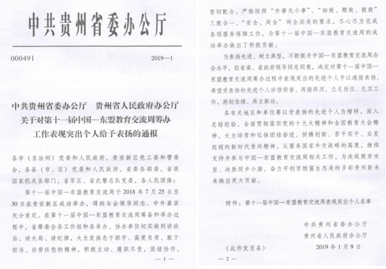 (“中共贵州省委办公厅 贵州省人民政府办公厅关于对第十一届中国—东盟教育交流周筹办工作表现突出个人”给予表扬的通报)