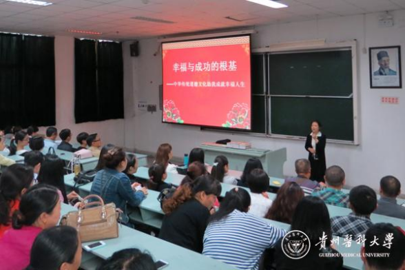 此次讲座以“幸福与成功的根基——中华传统道德文化助我成就幸福人生”为题,由贵州省谦德传统文化中心夏桂荣作主讲。讲座历时两个小时,生动形象,引人入胜。她认为,人与人的关系是仁爱,医德的核心是仁心仁术,人与宇宙万物的关系是慈悲。