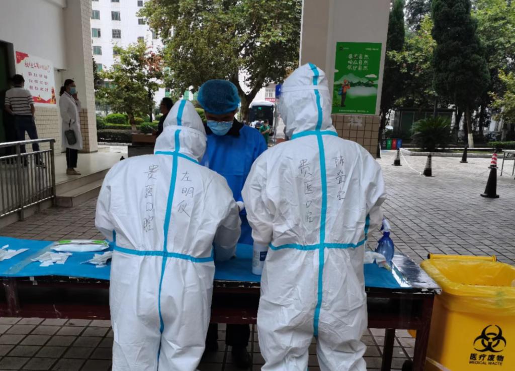 作为医员工,口院住培生主动践行志愿者精神,展现住培生担当,疫情期间有28名住培学员充分发挥自身优势,在认真学习口罩、防护服的规范穿戴及杀菌消毒等相关知识后,积极投入到疫情防控一线。在核酸检测现场,住培学员们积极奉献、敢于担当,用实践书写着新时代青年的责任与担当。除一线的志愿者外,后方还有默默无闻为疫情防控工作人员提供生活保障的后勤服务小组,每天对核酸采集队员的衣物进行消毒、清洗、晾晒,确保换洗衣物的正常供应,他们默默无闻为疫情防控工作提供着有力支持,成为了时刻守护在群众身边的“志愿红”。