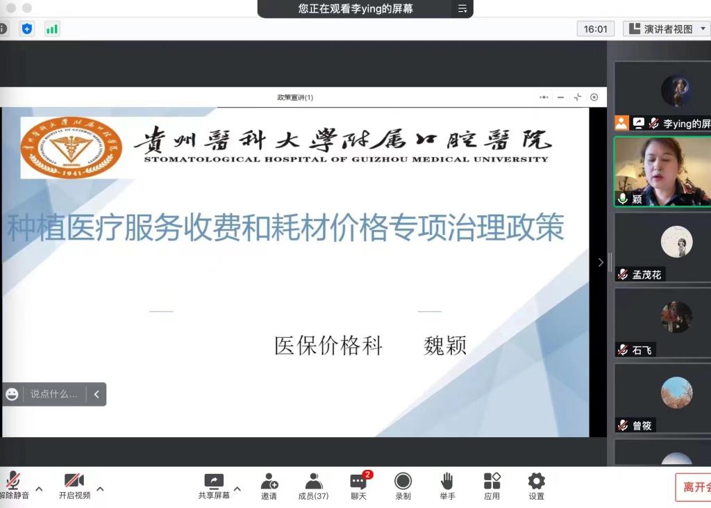 抗疫防控工作紧张激烈,疫情当前,公司医保价格科人员虽居家办公期间,依心系业务发展。为贯彻落实《国家医疗保障局关于开展口腔种植医疗服务收费和耗材价格专项治理的通知》(医保发〔2022〕27号),保障人民群众获得高质量、价格优的缺牙修复服务,促进医院口腔种植业务健康有序发展,医保价格科在科主任魏颖带领下,研读文件、查找资料、学习有关医疗知识,认真组织筹备,在9月20日下午,与口腔修复种植科围绕文件精神开展了线上专项工作会议。院统战委员、口腔修复种植科主任董强和医保价格科科长魏颖与两科室全体成员踊跃参加此次会议。