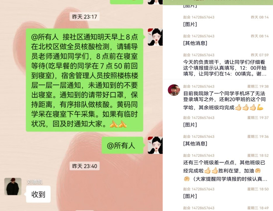 “黄码”在家,不能和同事们在抗疫一线共同战斗,那就做辅导员队伍坚实的后盾!每天完成全院员工“今日校园”上面健康信息填报成了我最重要的事。“班干们,督促同学们打卡哈”,“今天负责的班干,自行认领本班未打卡同学,电话联系……”,“只剩最后几个啦,大家加油!”每天不断的在群里面催促同学们完成健康信息填报,班干们也被我反复“折磨”。但大家都知道,打卡不是目的,只是监测同学们目前健康状况的手段,同学们按时、准确的打卡对于公司疫情防控具有重要意义,因此也认真主动配合。在这里向各位班干说声:辛苦了!摸排员工情况,进行数据上报、抗疫宣传、线上教学、解决员工各种问题、安排完成公司下发的各项工作……疫情发生以来,每天和表格“战斗”,反复核对、仔细筛查、准确上报,精神时刻紧绷着,不敢睡得太沉,就怕错过重要消息和员工的电话,手机一响立刻惊醒。大“疫”当前,无数医护人员、辅导员、班委和志愿者们都在齐心协力对抗疫情,同学们有责任做好防控,积极主动配合公司的疫情防控工作,按时、准确完成信息上报。也谢谢同学们的理解和配合,没有嫌弃我的碎碎叨叨,我们携手共同努力,等疫情结束,再去把想吃的美食吃遍,想去的大好河山看过,拥抱亲爱的家人朋友们。